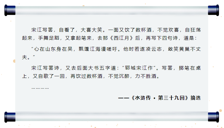 于是,在酒勁兒慫恿之下,宋江提筆揮毫,在潯陽樓上寫了一首詩:“心在山東身在吳,飄蓬江海謾?quán)涤酢K麜r(shí)若遂凌云志,敢笑黃巢不丈夫!”臨了,還不忘署上自己的大名——鄆城宋江。