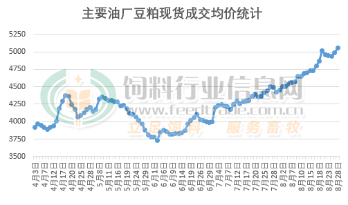 據(jù)飼料行業(yè)信息網(wǎng)數(shù)據(jù)顯示:8月28日,國內(nèi)豆粕市場均價突破5000元/噸大關(guān),創(chuàng)下了自6月份觸底反彈以來的新高。