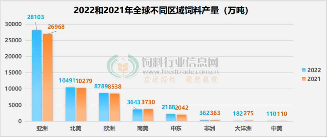 首先,從地區(qū)來看,仍然是亞洲和北美洲飼料產(chǎn)量過億噸,但是中東地區(qū)同比增幅最多,達(dá)7.15%,而大洋洲同比降幅最大,超過33%。