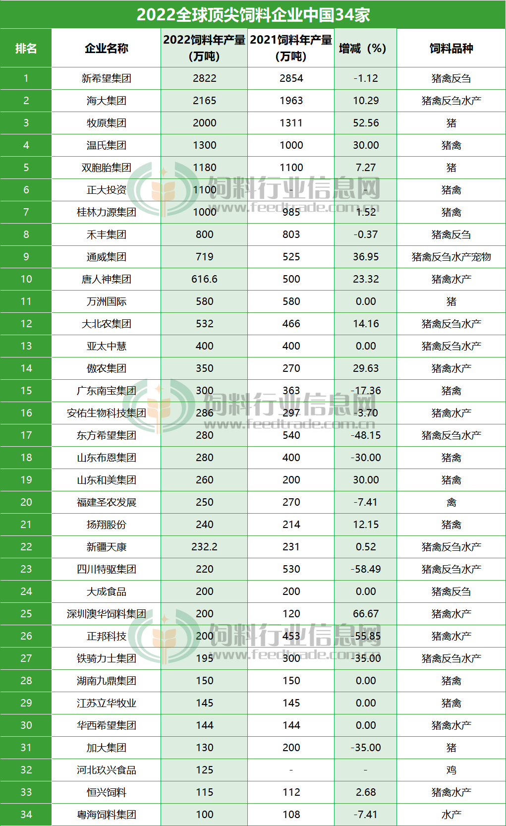 【行業(yè)觀察】2022年全球147家頂尖飼料企業(yè)產(chǎn)量超5.38億噸,中國(guó)上榜34家