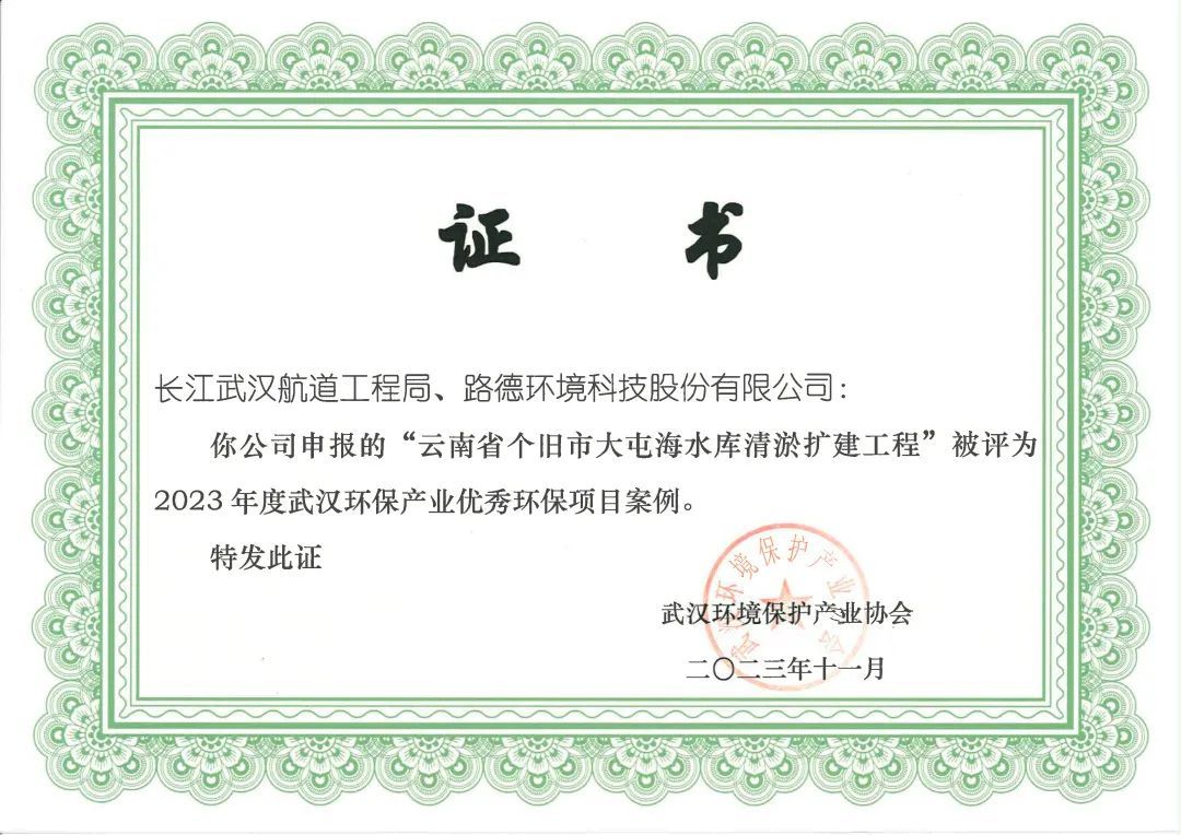 公司“云南省個舊市大屯海水庫清淤擴建工程”被武漢環(huán)境保護產(chǎn)業(yè)協(xié)會評選為“2023年度武漢環(huán)保產(chǎn)業(yè)優(yōu)秀環(huán)保項目案例”。