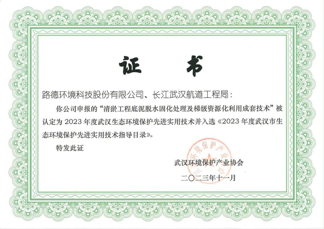 公司“清淤工程底泥脫水固化處理及梯級資源化利用成套技術(shù)”被武漢環(huán)境保護產(chǎn)業(yè)協(xié)會認定為“2023年度武漢生態(tài)環(huán)境保護先進實用技術(shù)”并入選《2023年度武漢市生態(tài)環(huán)境保護先進實用技術(shù)指導(dǎo)目錄》。