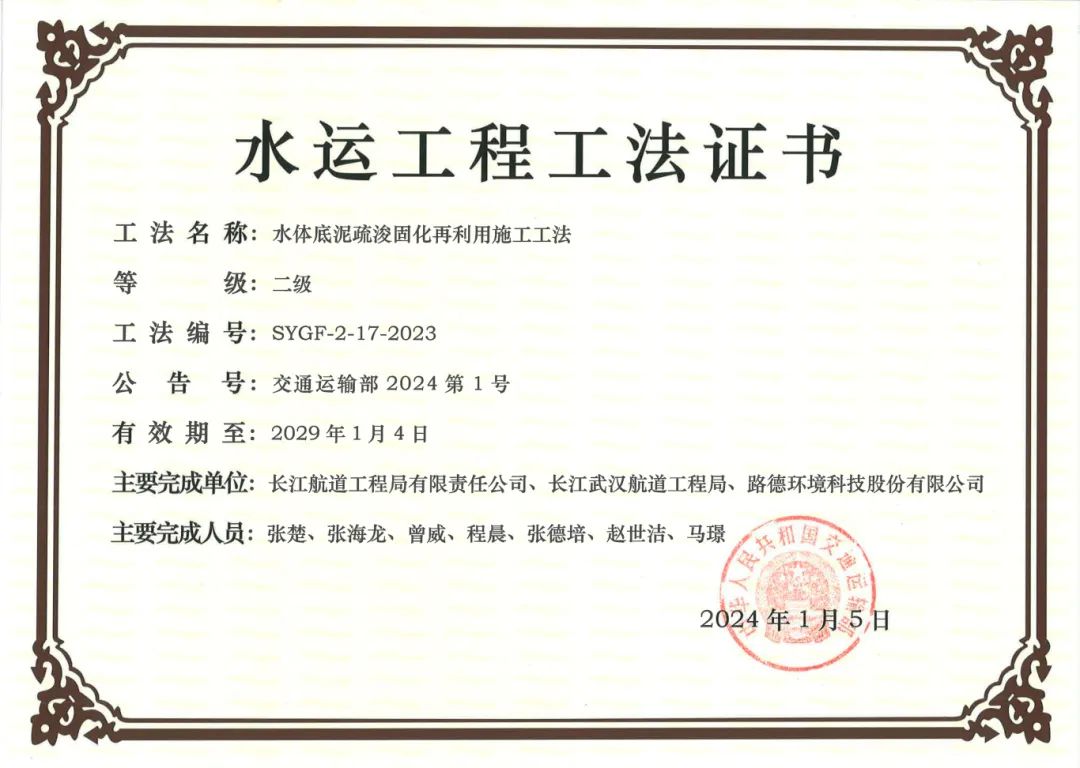 近期,交通運(yùn)輸部公布了2023年度水運(yùn)工程工法評(píng)審結(jié)果,路德環(huán)境聯(lián)合長(zhǎng)江航道工程局有限責(zé)任公司、長(zhǎng)江武漢航道工程局共同申報(bào)的“水體底泥疏浚固化再利用施工工法”榮獲交通運(yùn)輸部2023年度水運(yùn)工程二級(jí)工法。