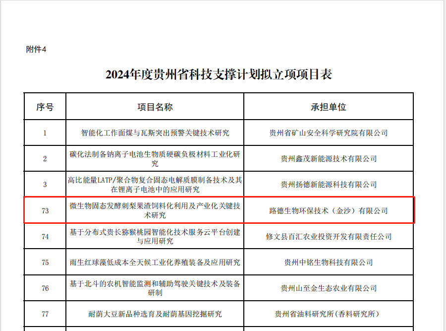 近日,貴州省科學技術(shù)廳公布了省科技計劃擬立項項目,路德環(huán)境旗下子公司——路德生物環(huán)保技術(shù)(金沙)有限公司承擔的“微生物固態(tài)發(fā)酵刺梨果渣飼料化利用及產(chǎn)業(yè)化關(guān)鍵技術(shù)研究”項目,入選“2024年度貴州省科技支撐計劃擬立項項目”。
