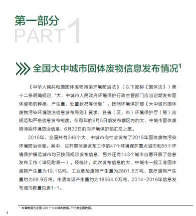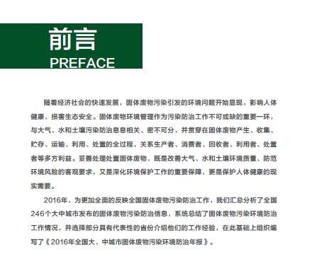 環(huán)保部發(fā)布《2016年全國(guó)大、中城市固體廢物污染環(huán)境防治年報(bào)年報(bào)》,匯總分析了全國(guó)246個(gè)大中城市發(fā)布的固體廢物污染防治信息,系統(tǒng)總結(jié)了固體廢物污染環(huán)境防治工作情況,并選擇部分具有代表性的省份介紹他們的工作經(jīng)驗(yàn)。