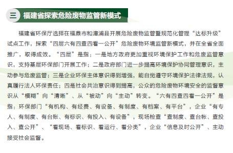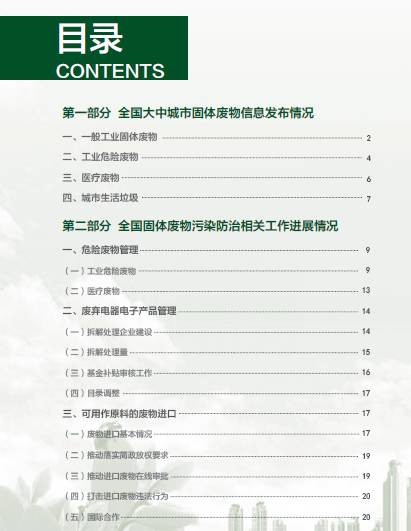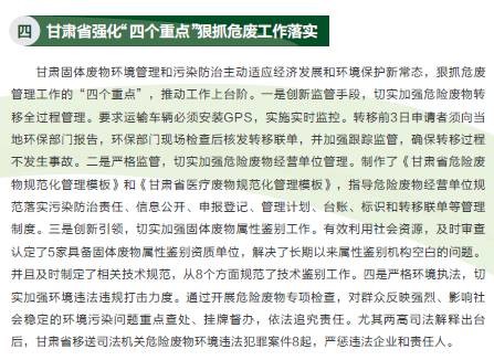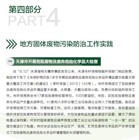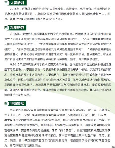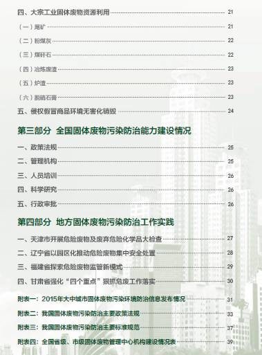 《年報(bào)》還介紹了我國(guó)現(xiàn)行固體廢物污染防治主要政策法規(guī)、固體廢物管理機(jī)構(gòu)能力建設(shè)情況、固體廢物管理技術(shù)培訓(xùn)情況以及固體廢物污染防治相關(guān)科研成果。并選擇4個(gè)代表性省份,介紹了他們?cè)诮鉀Q固體廢物管理重點(diǎn)、難點(diǎn)問(wèn)題方面的經(jīng)驗(yàn)和做法。